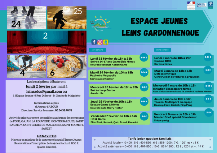 Au programme : une soirée action game à Nîmes pour les 14-17 ans, une sortie patinoire à Montpellier, un escape game sur le thème Harry Potter, une sortie cinéma, ainsi qu’une initiation au skate encadrée par une association Nîmoise.