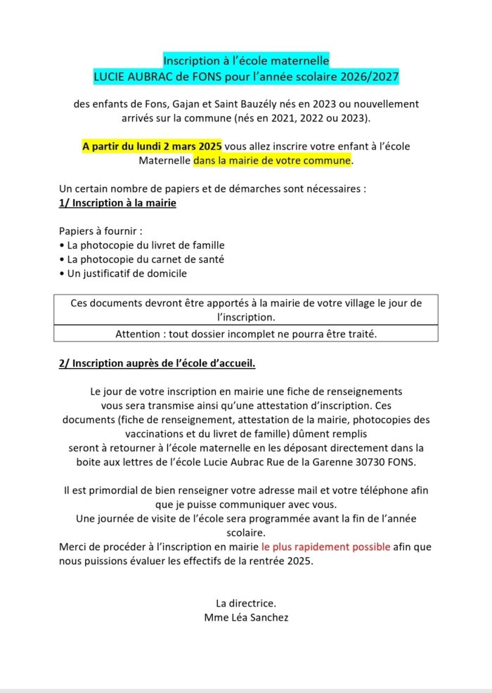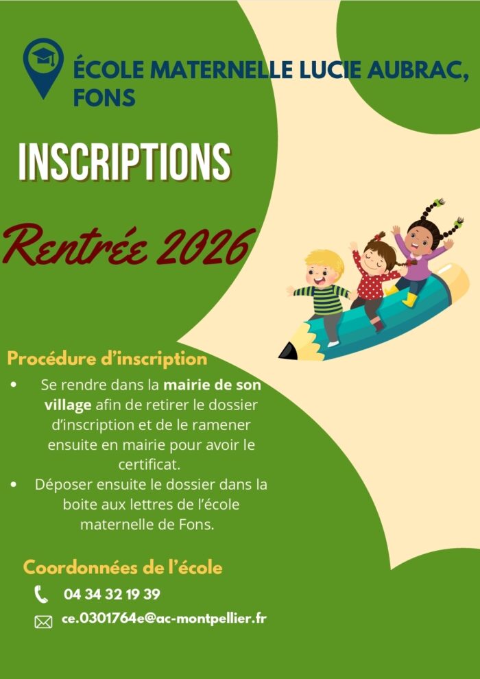 📝Inscription à l’école maternelle LUCIE AUBRAC de FONS pour l’année scolaire 2026/2027 📝