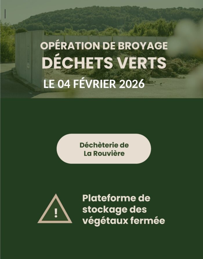 Nous vous informons qu’une opération de broyage des déchets verts est prévue sur la déchèterie de LA ROUVIERE le MERCREDI 04 FÉVRIER 2026.